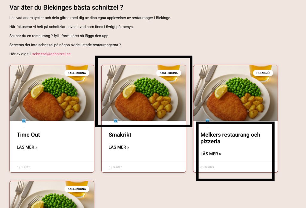 Du som driver restaurang som serverar schnitzel har möjlighet att profilera dig på schnitzel.se med mer innehåll och bättre kontaktvägar.