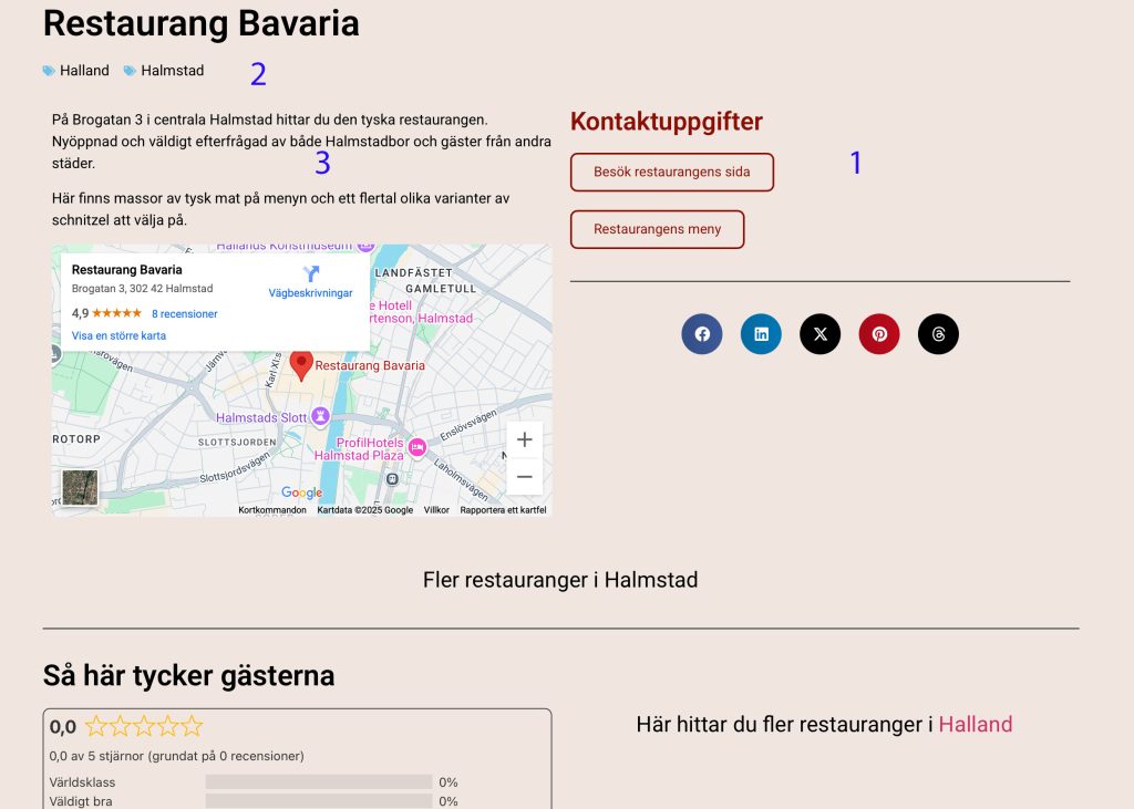 - Utökad kontaktinformation i form av länk till din hemsida, ditt telefonnummer, din epost och eventuell separat länk till meny. (nr 1 nedan)